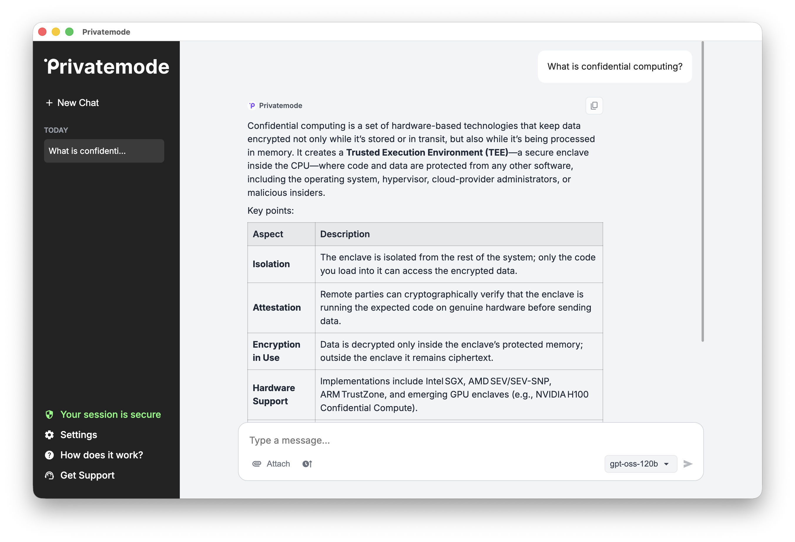 Using confidential computing, Privatemode encrypts your data before it leaves your device and keeps it protected even during AI processing. This ensures that your information remains secure at all times.