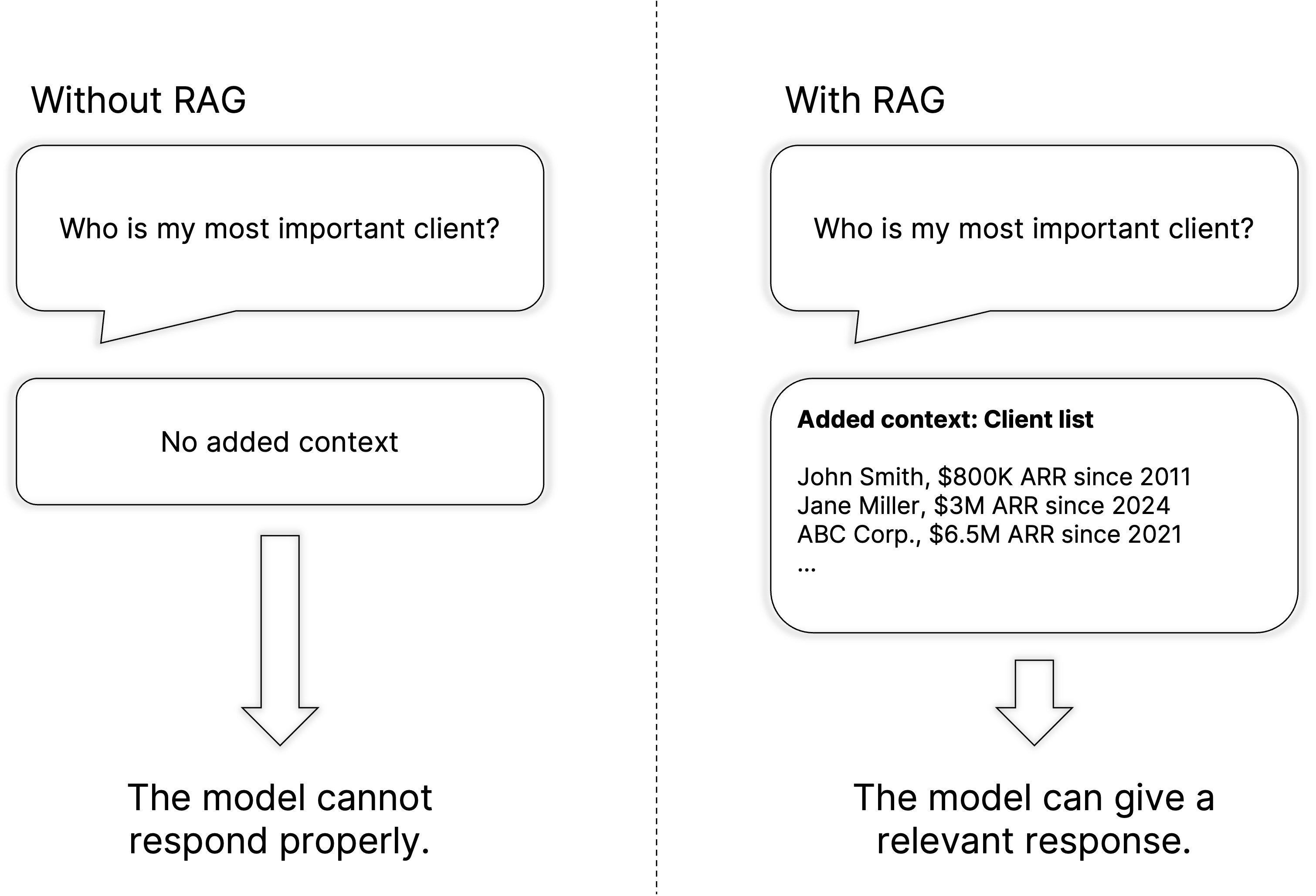 Retrieval augmented generation (RAG) is a technique to enhance the quality of AI responses when querying about specific information by adding custom context to the prompt (“enriching”). Instead of relying only on the model’s training data (which suffices for most generic questions), custom, often company-specific information is provided to the model as context.