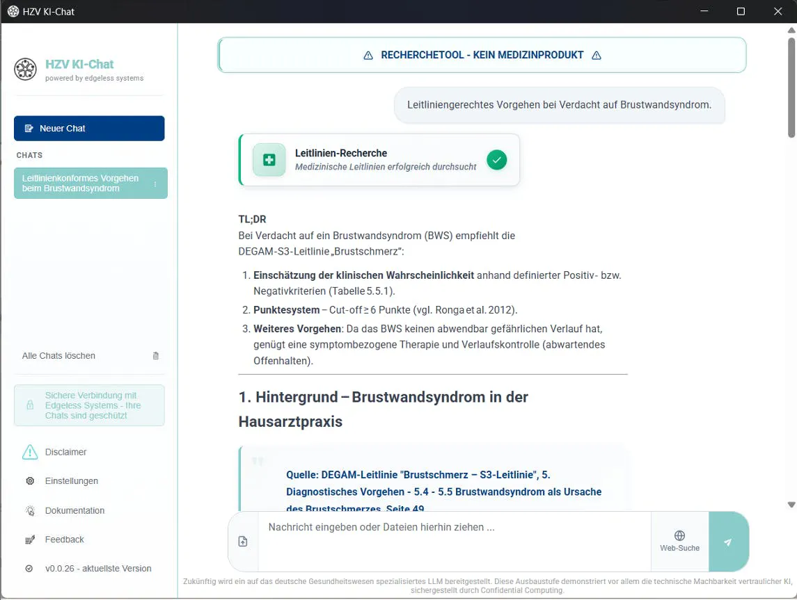 At the same time, the HZV AI Chat offers the possibility of being enriched with domain knowledge. In the feasibility study, enrichment with medical domain knowledge in the form of selected medical guidelines was tested, with the provision and use of this knowledge taking place under strict quality assurance processes. Looking ahead, enrichment with HZV domain knowledge as well as the use of specialized medical LLMs are planned.