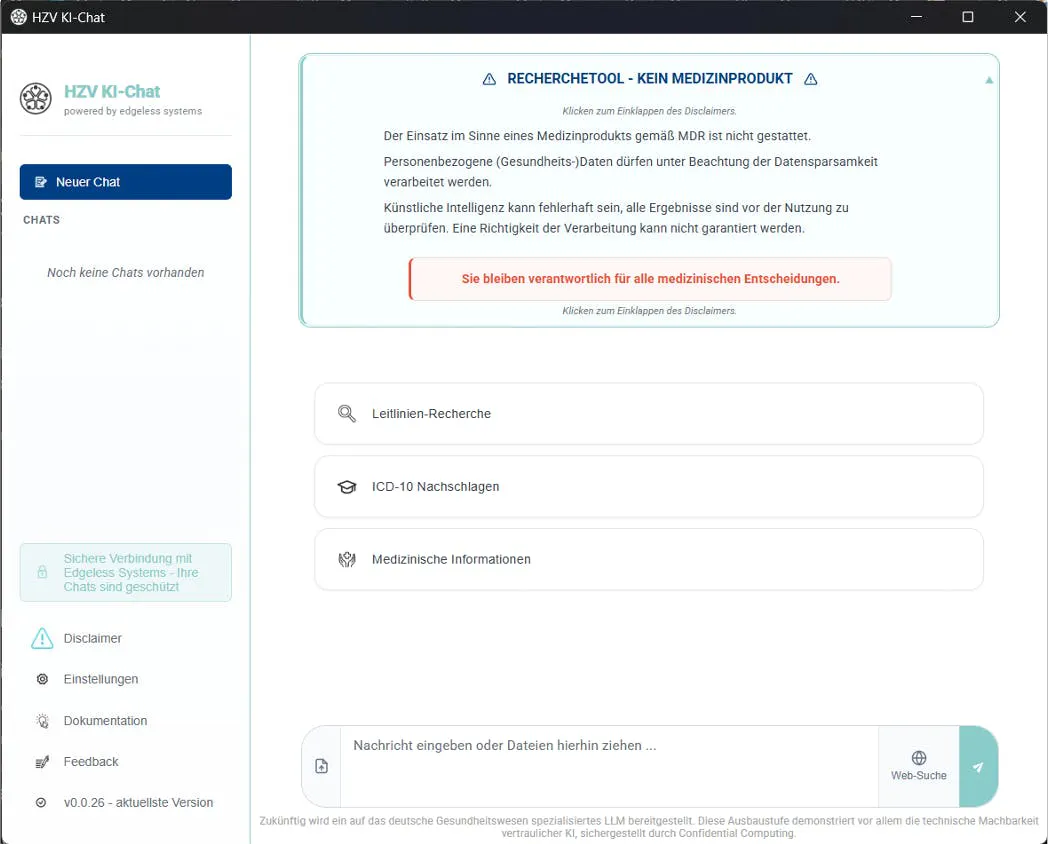On the basis of Privatemode, HÄVG has developed an "HZV AI Chat" that can be used as a secure AI chat by all staff members of the general practitioner practice. An option for internet integration was also implemented in a data-protection-compliant manner by means ofverifiable human-in-the-loop search queries.