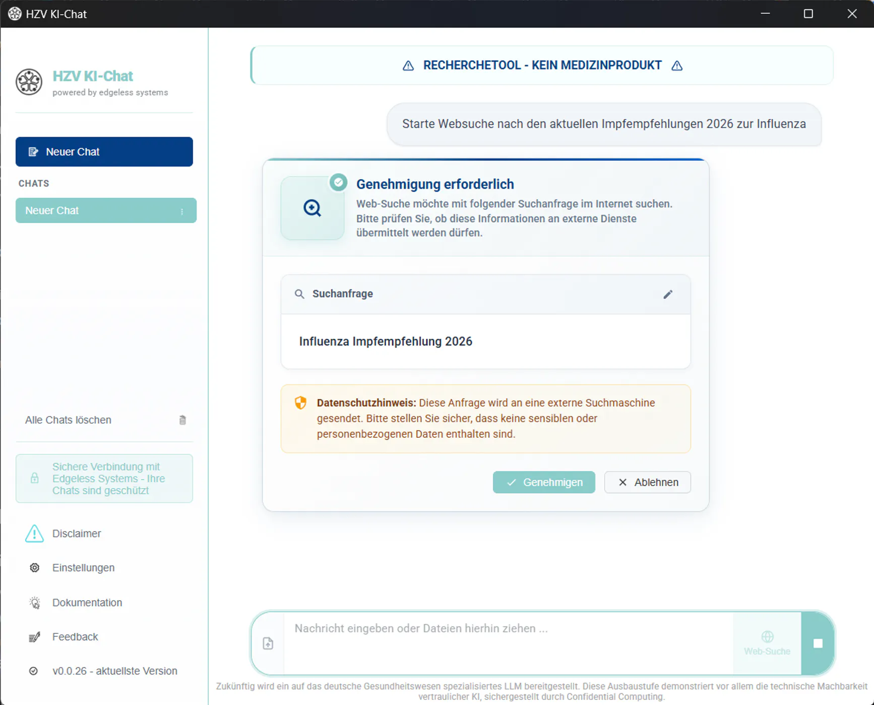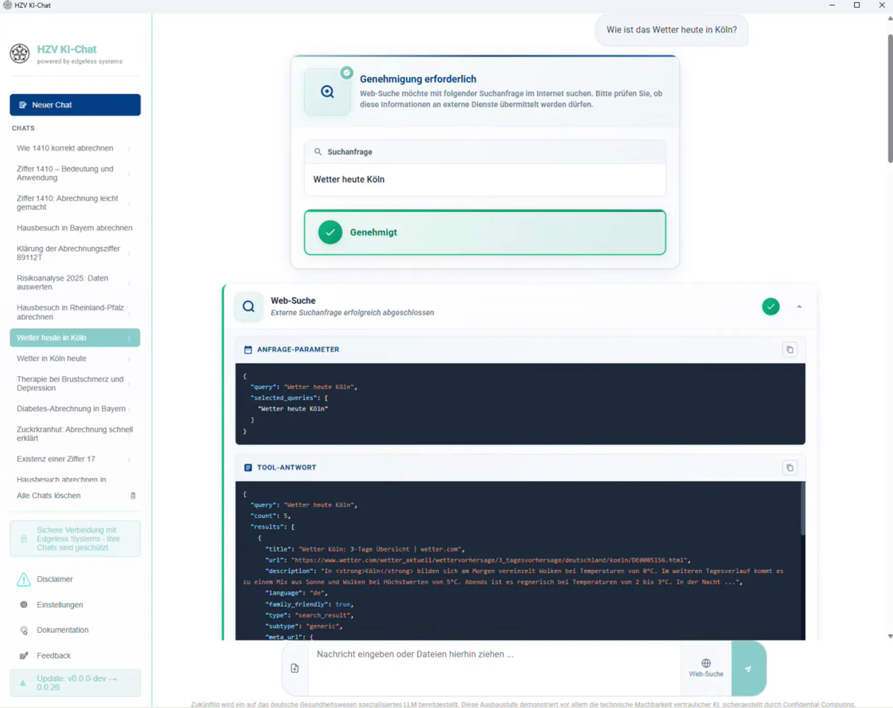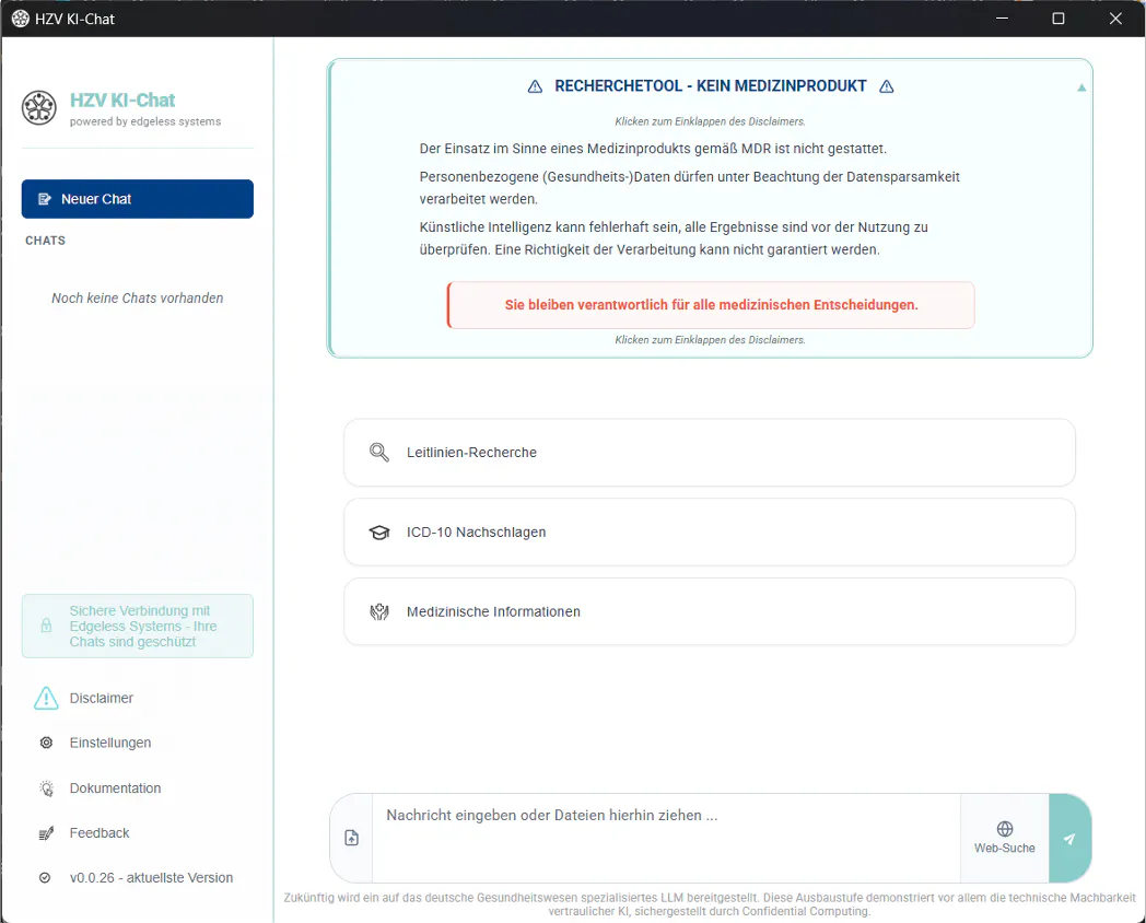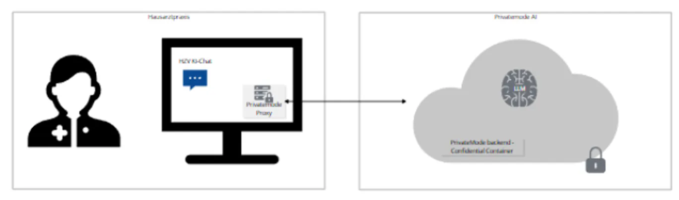 On the basis of Privatemode, HÄVG has developed an "HZV AI Chat" that can be used as a secure AI chat by all staff members of the general practitioner practice. An option for internet integration was also implemented in a data-protection-compliant manner by means ofverifiable human-in-the-loop search queries.
