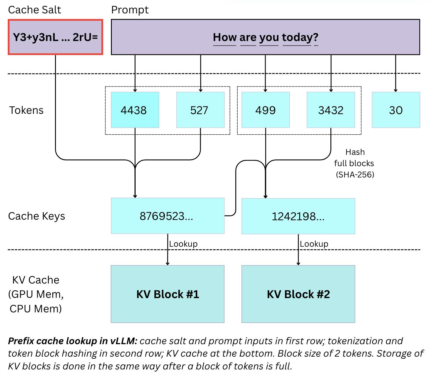 Wie in der Abbildung oben zu sehen, übergibt der Nutzer zusammen mit dem Prompt einen Cache‑Salt. Aus Effizienzgründen organisiert vLLM den Prompt‑Cache in Token‑Blöcken (in diesem Beispiel zwei Token; üblicherweise länger). Wenn der Cache‑Lookup‑Key per Hashing der Input‑Token berechnet wird, wird der Salt dem ersten Token‑Block hinzugefügt. Um Kollisionen zu vermeiden, haben wir zudem Unterstützung für das Hashen von Token mittels SHA‑256 umgesetzt. Der Hash eines Blocks fließt in den Hash des nächsten Blocks ein und erzeugt so eine eindeutige Sequenz von Cache‑Lookup‑Keys. Dies ist notwendig, da Attention‑Werte Informationen über vorherige Token enthalten und Blöcke nicht isoliert wiederverwendet werden können. Unvollständige Blöcke werden nicht gecacht, d. h. Attention‑Keys und ‑Values werden für diese Token neu berechnet.