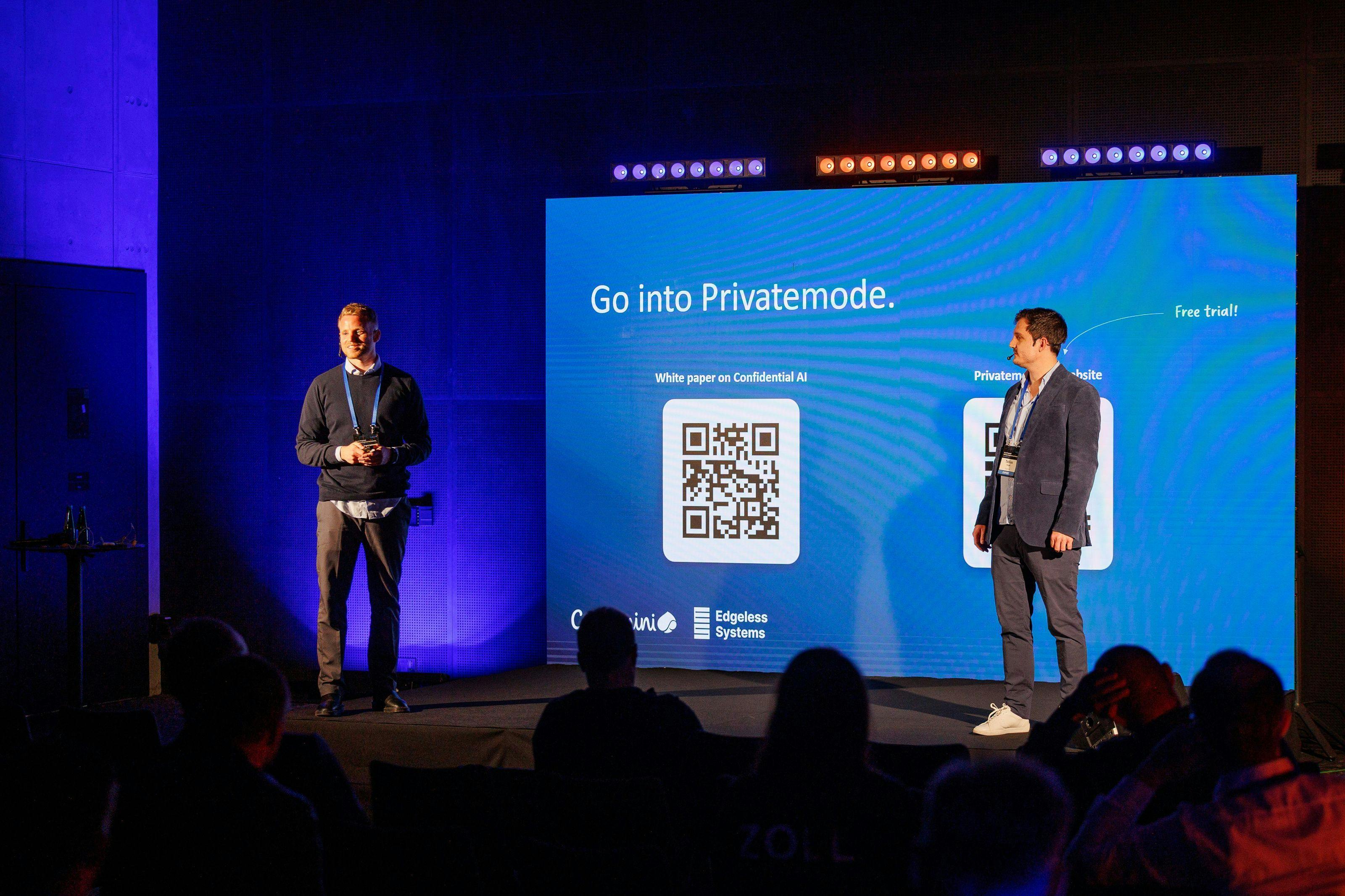 Capgemini hat einen Blogbeitrag über Privatemode AI veröffentlicht, der auch den Einsatz von vertraulichen Programmierassistenten in regulierten Branchen beschreibt. Unten sehen Sie Bilder vom GenAI Powered Software Engineering Summit von Capgemini, wo wir den Anwendungsfall gemeinsam präsentiert haben.
