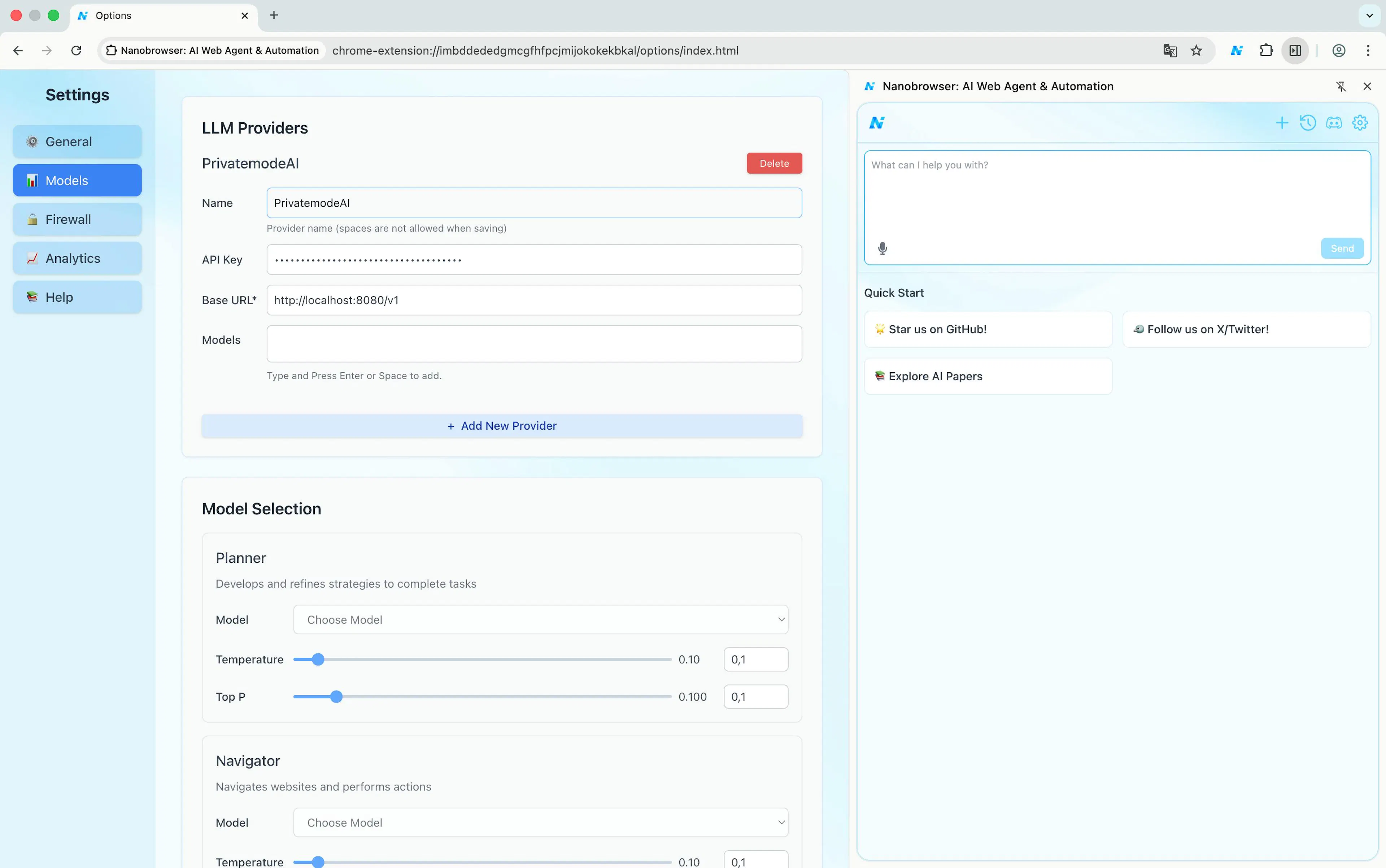Nanobrowser has built-in support for custom OpenAI-compatible providers. Add Privatemode in the Settings panel and both agents use it instantly, no workarounds needed.