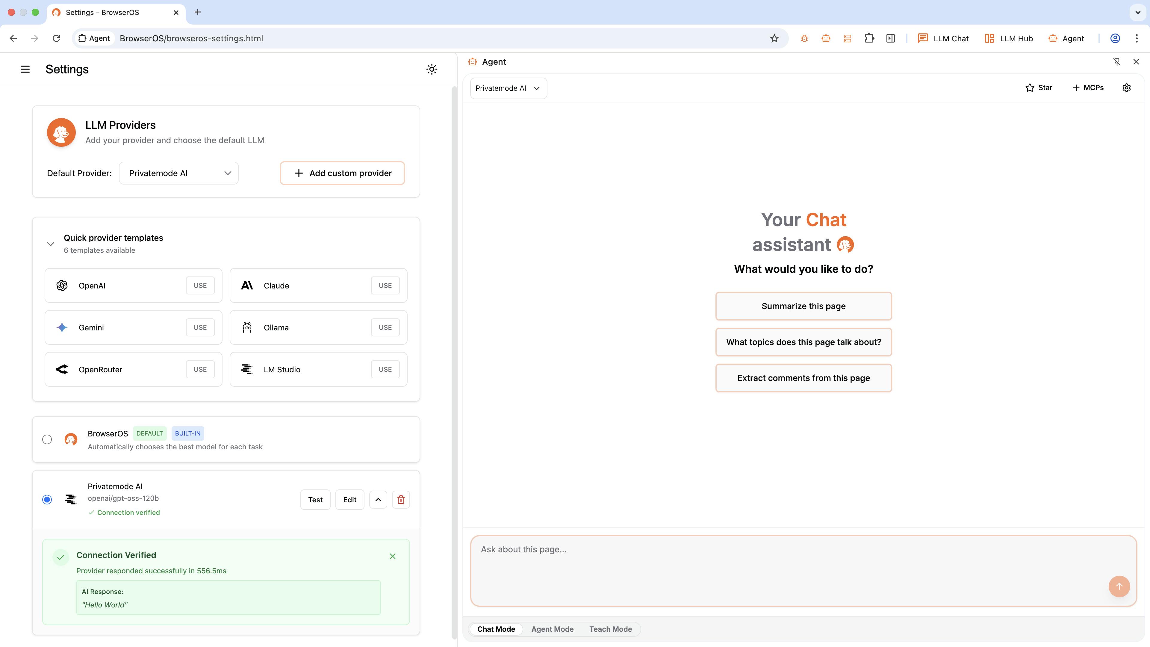 You can start using Privatemode in minutes. The setup is straightforward and fully compatible with BrowserOS.