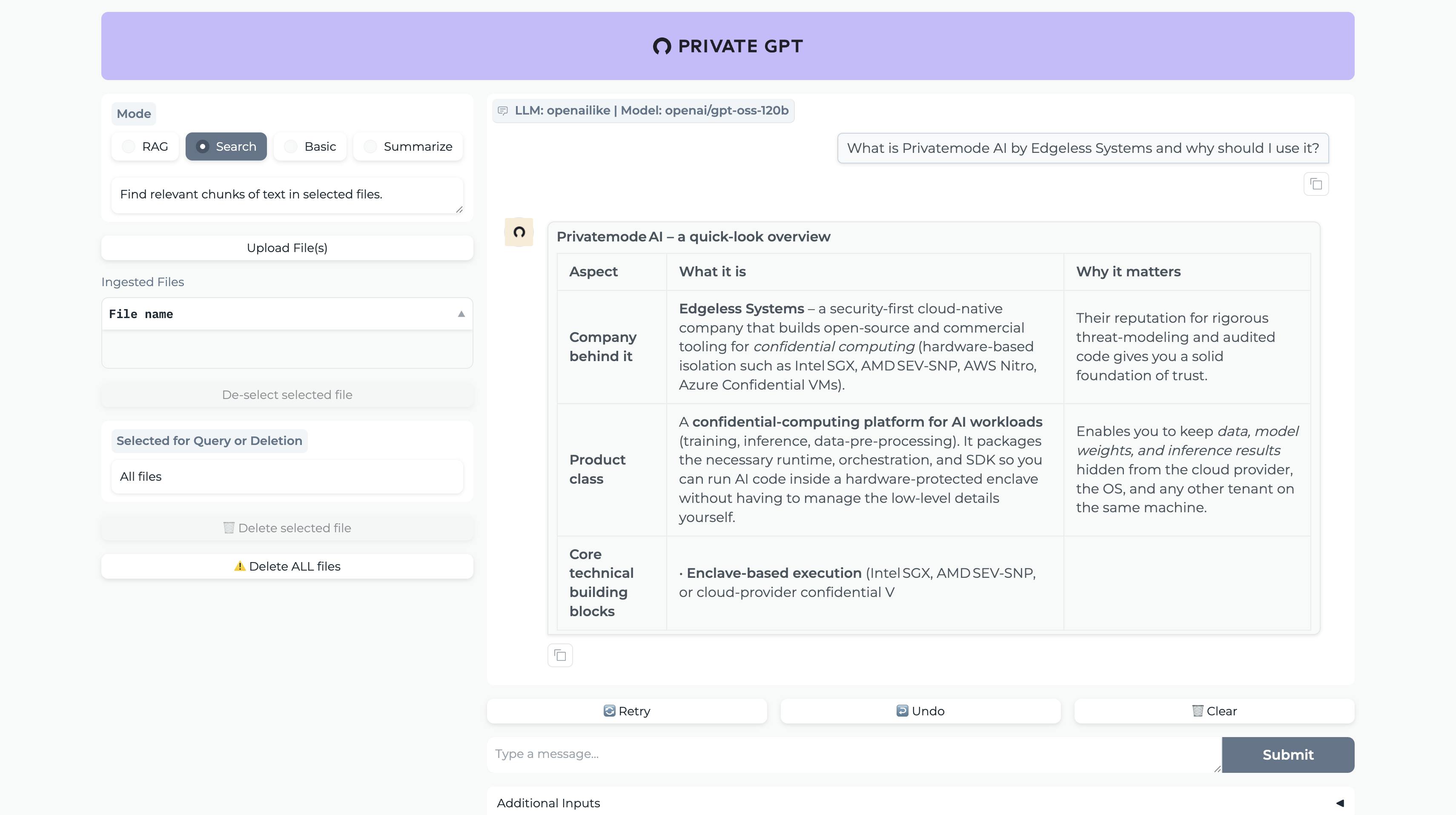 Integrating Privatemode into PrivateGPT brings cloud-AI capabilities to your AI interface while keeping your data confidential through end-to-end encryption and confidential computing. Plus, Privatemode is designed to never learn from your data.