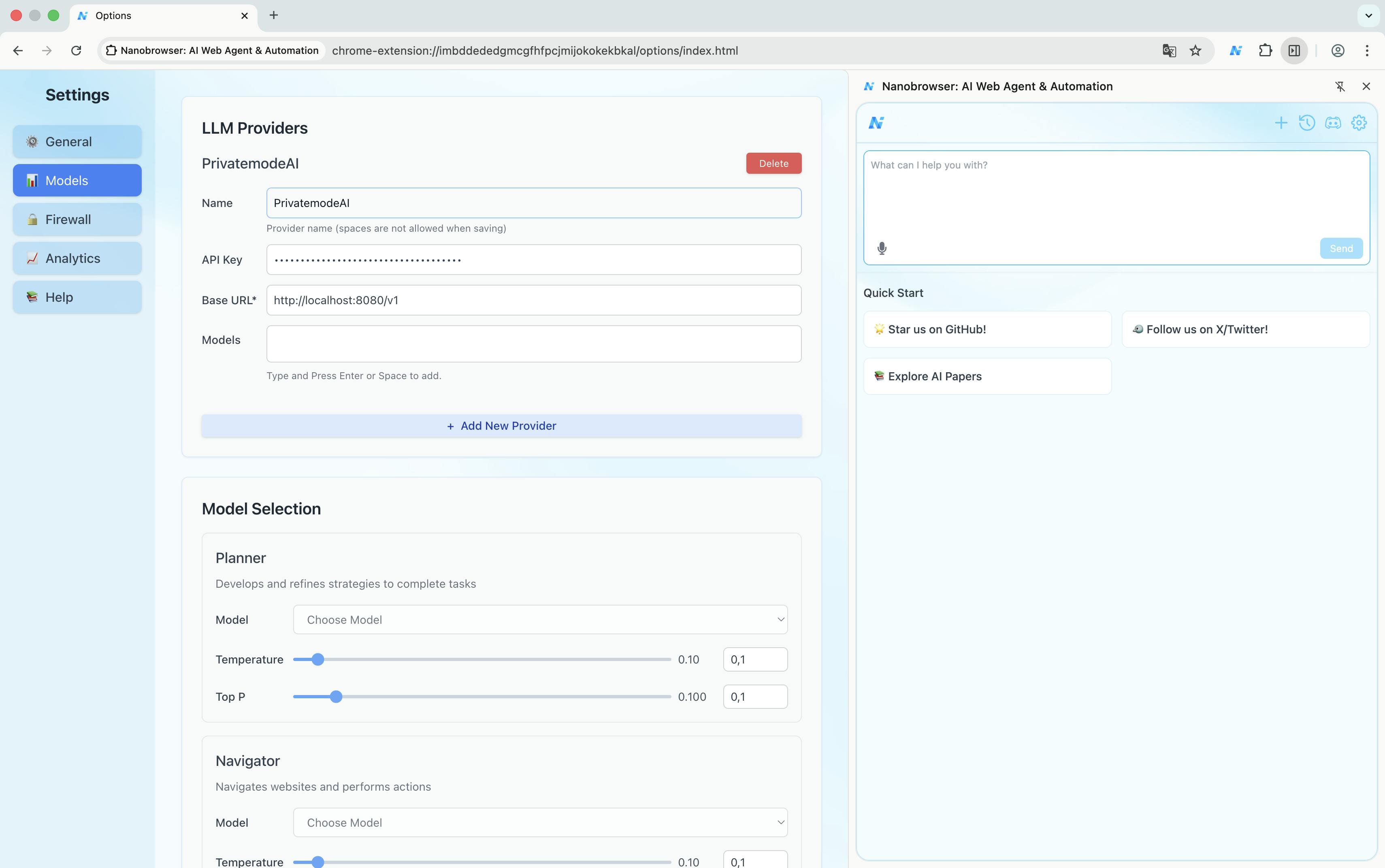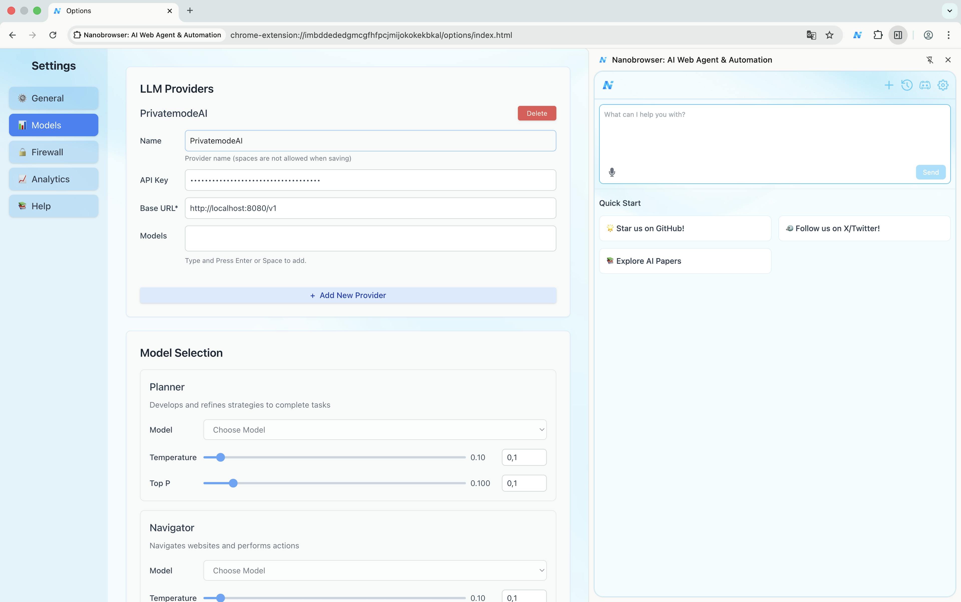 You can start using Privatemode in minutes. The setup is straightforward and fully compatible with Nanobrowser.